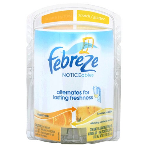 Febreze NOTICEables is an alternating scent oil warmer. Simply plug it into a wall outlet and adjust to your preferred level of scent intensity. A soft green light indicates which scent is working as it automatically alternates between two complementary scents throughout the day to continuously refresh your senses. Read more...